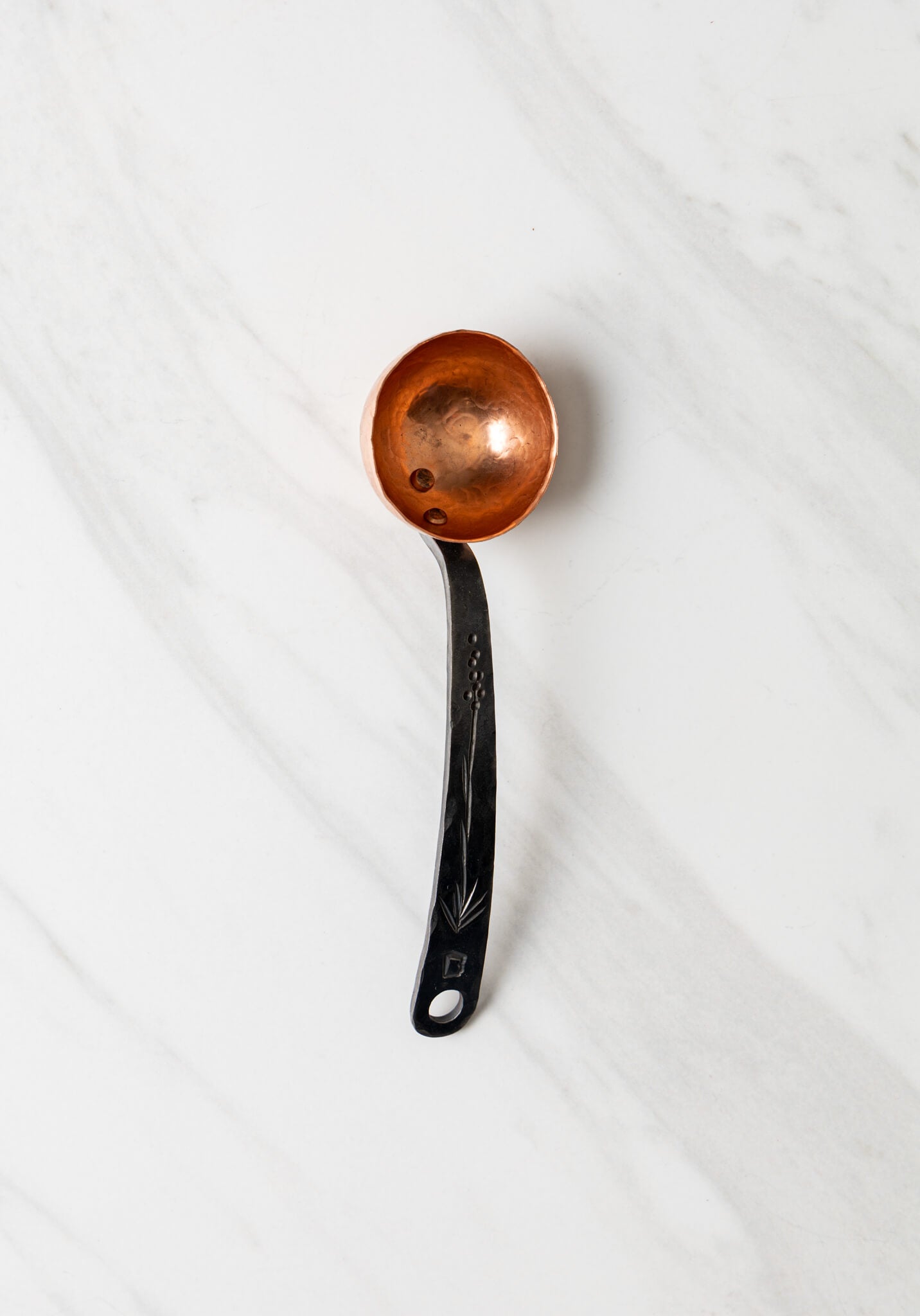 Add a touch of elegance to your morning coffee ritual! This beautiful coffee scoop is made from a forged stainless steel handle and a hand-hammered copper cup. The handle has a slight arch and a hole in the end for hanging. This model features a beautiful hand-chiseled Sotol plant, a beautiful desert plant native to Arizona. The scoop holds a little over two tablespoons.